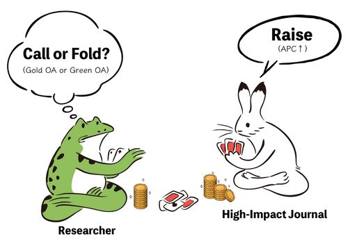 オープンサイエンスの即時OAに関する話を聞いていて「ブランド力を梃子にAPCを上げ続ける出版社と、それに研究者がどこまで乗り続けるかのチキンレース」っぽいなぁというイメージが浮かんで作成した画像です。 うまくできたわぁと思ったのですが、よく考え…